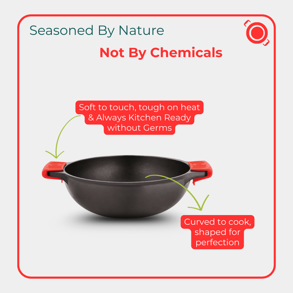 Super Cool Silicon Sleeves: Silicon have better heat resistance (upto 204°C) than Bakelite handles and are germ free. The rubber like feel gives better grip and ease the cooking process.