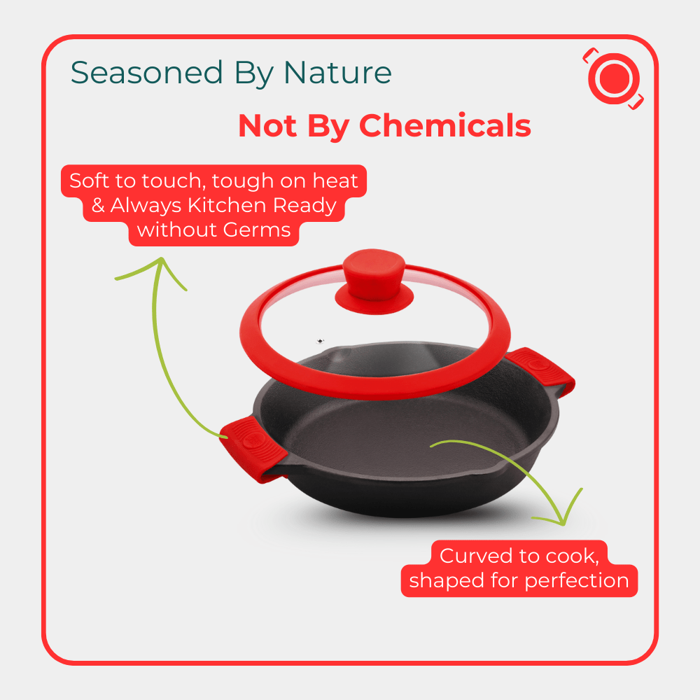 Super Cool Silicon Sleeves: Silicon have better heat resistance (upto 204°C) than Bakelite handles and are germ free. The rubber like feel gives better grip and ease the cooking process.