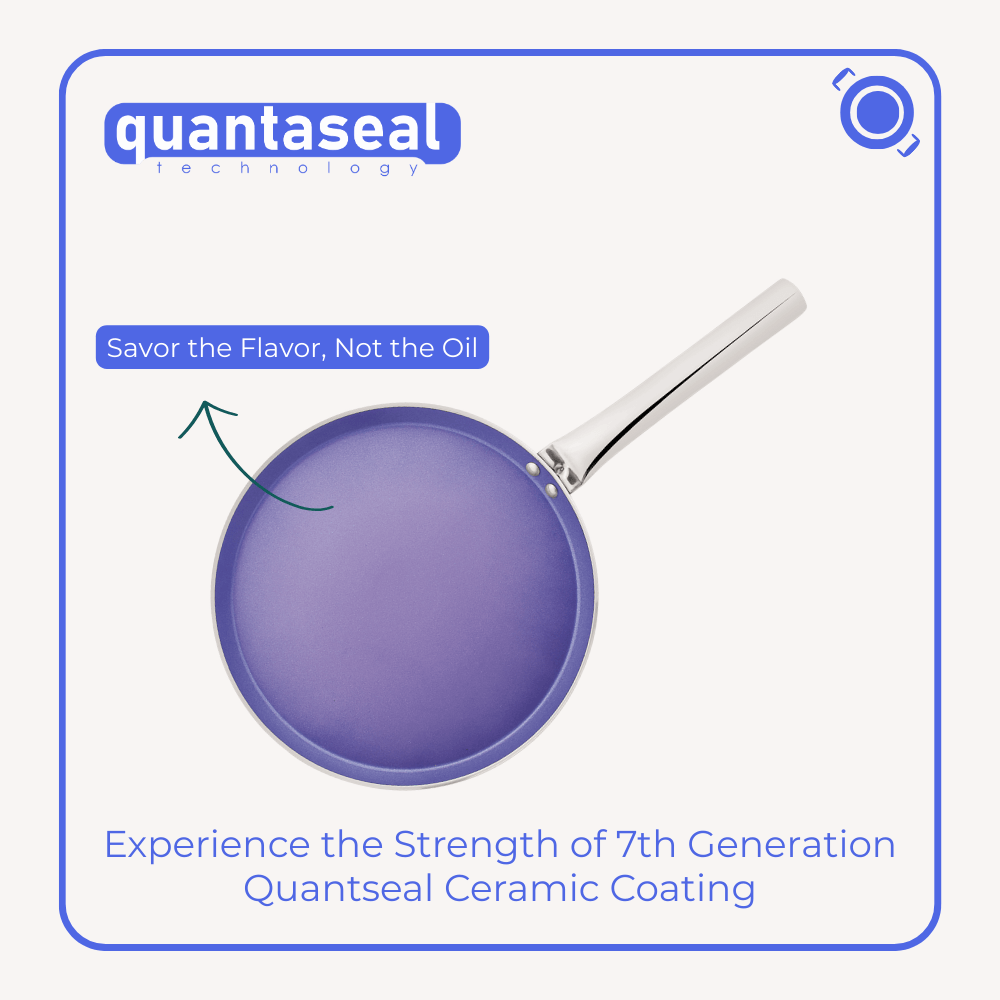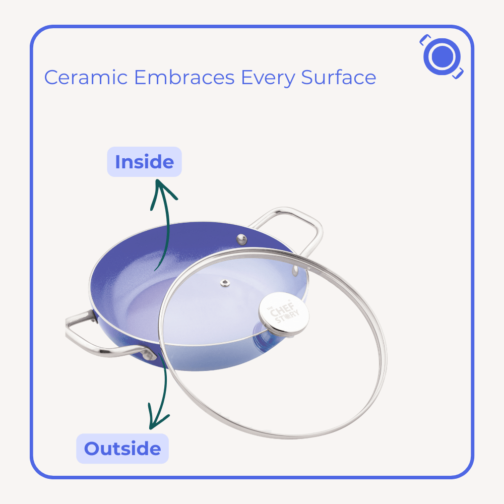 Careful cooking begins with cookware you can rely on through everyday use. Built with advanced 7th Generation Quantaseal™ Ceramic Coating, this Ceramic Trio Set of Fry Pan, Tawa and Kadai supports thoughtful cooking with its smooth, non-porous surface and consistent non-stick performance. Created to resist scratches and routine wear, it remains sturdy even with metal utensils and is produced without PFOA, lead, cadmium, nickel, or arsenic for a healthier kitchen space. Its food-grade build spreads heat uniformly across gas, induction, and ceramic cooktops, supporting both gentle simmering and high-heat cooking. Blending lasting strength with refined elegance, this set also supports tree-plantation efforts, caring for homes and the planet with every meal prepared.