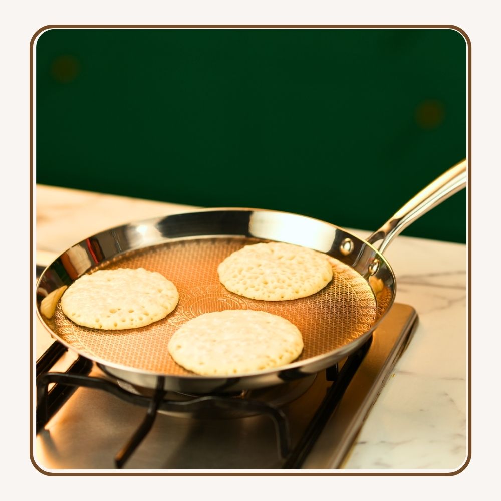 On the stovetop, the honeycomb tawa spreads heat evenly so breads, wraps, and pancakes cook without hot spots. The shallow, open form makes flipping simple, while the textured surface helps food lift without clinging. Strong enough for daily use and adaptable to gas, induction, and electric hobs, it’s as easy to rinse clean as it is to handle.
